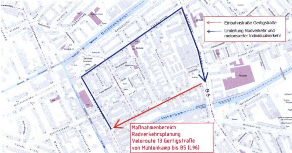 Während der Bauarbeiten an den Gehwegen wird in der Gertigstraße eine Einbahnstraße von der Barmbeker Straße in Richtung Mühlenkamp eingerichtet.